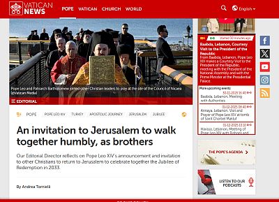 "Pope Leo XIV’s announcement and invitation to other Christians to return to Jerusalem to celebrate together the Jubilee of Redemption in 2033."